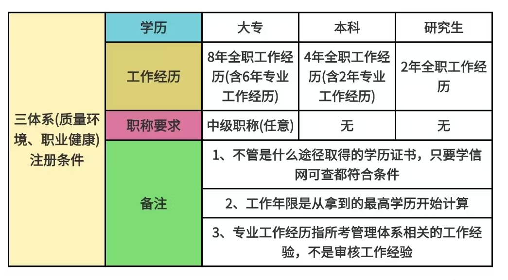 便于扩展其他体系,如果三体系考试完成后,未来想考其他体系(如食品安全管理体系),可以根据自己的学历、专业和工作背景选择扩展。
