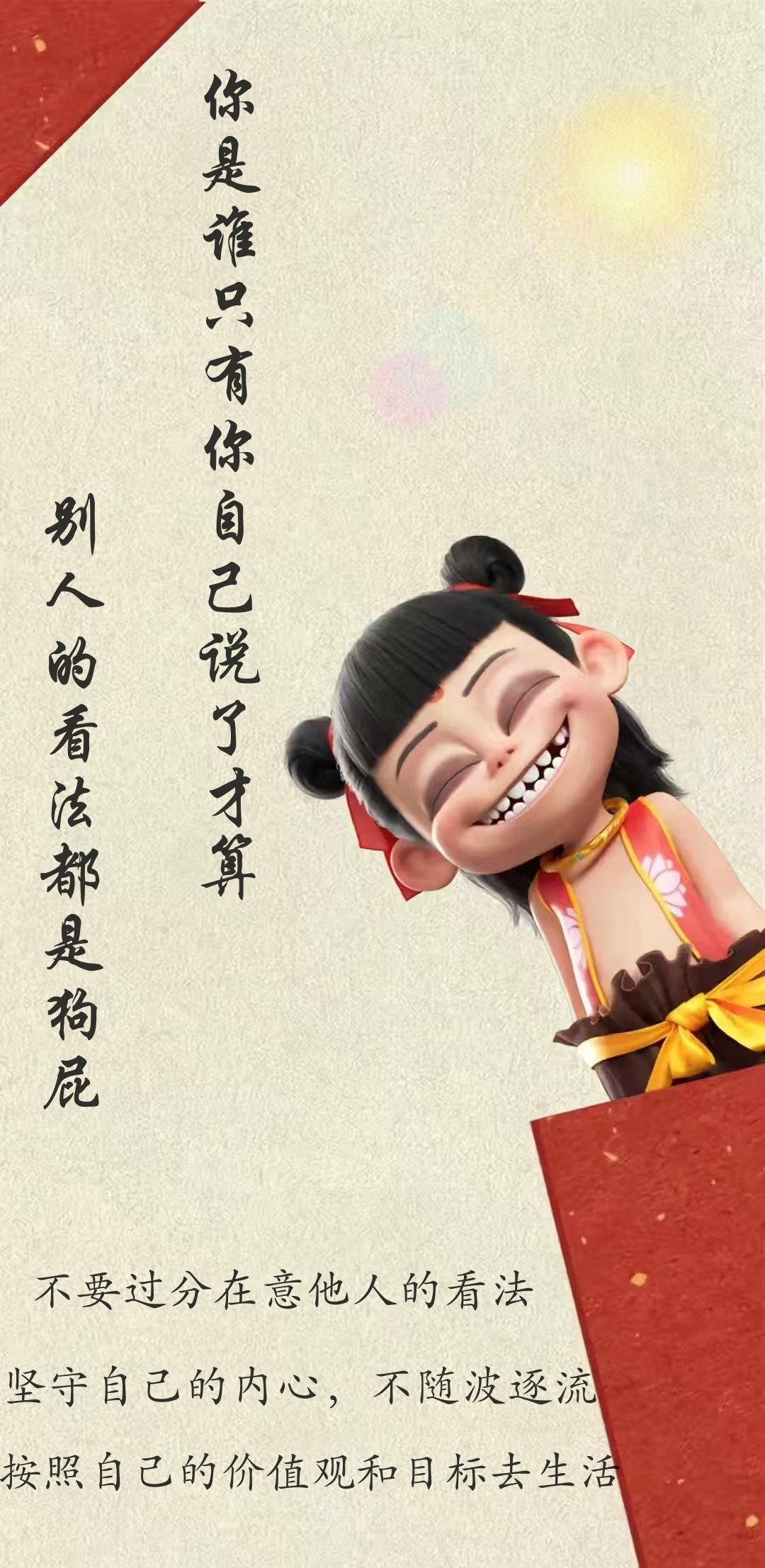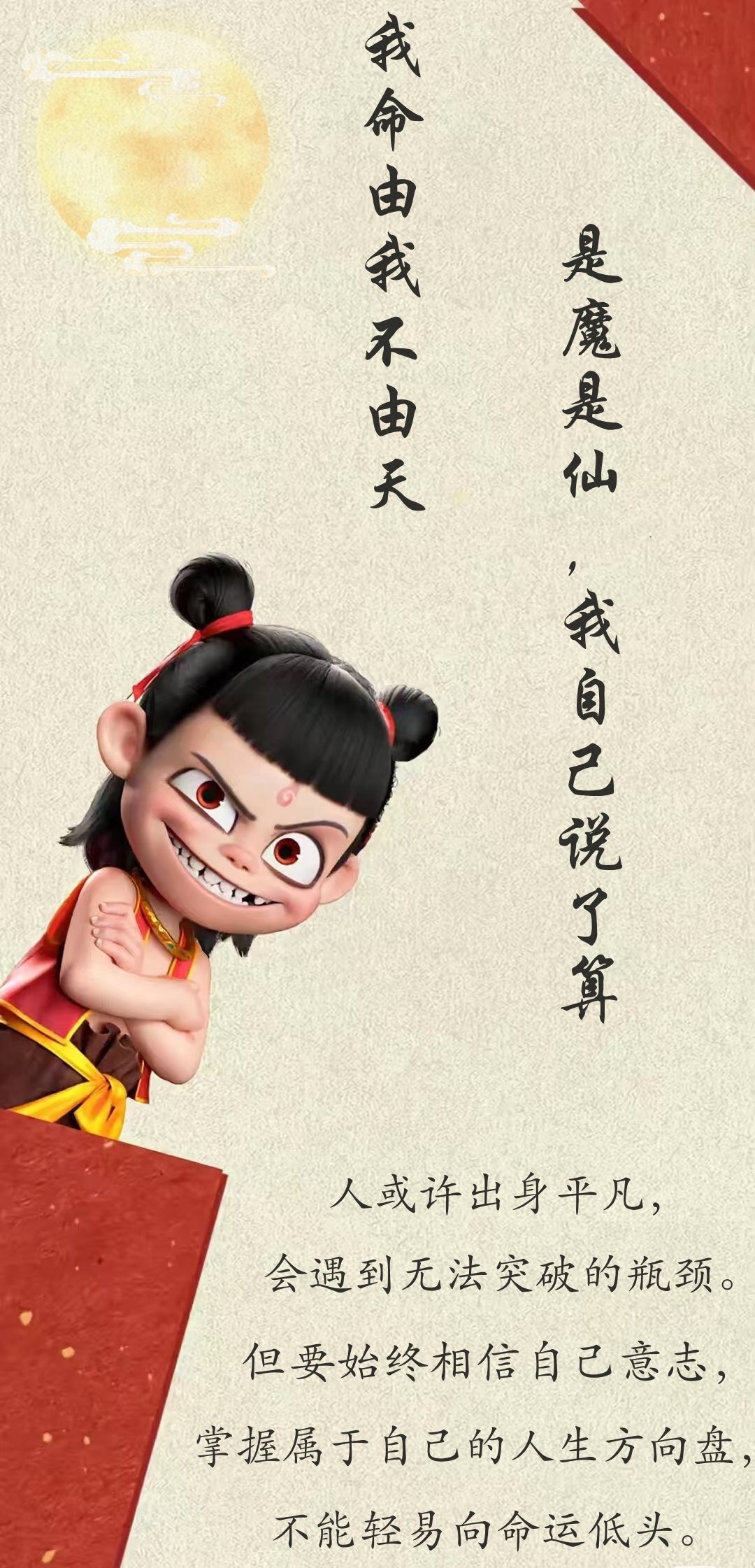 国产动画电影《哪吒之魔童闹海》(以下简称《哪吒2》)票房持续打破纪录。据灯塔专业版,截至2月13日19时11分,电影《哪吒2》的票房(含预售及海外票房)达到100亿元,成为我国首部百亿电影,位列全球动画电影票房榜第3,并跻身全球影史票房榜第17位。那观看完又带给你哪些启示呢?以下是小编整理的很喜欢的四句金句,分享给大家。