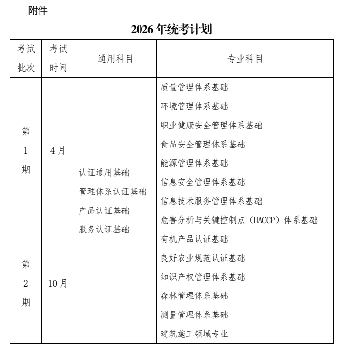 为方便考生全面了解认证人员注册全国统一考试(简称统考)安排,合理安排报考,现将2026年考试计划予以公布(详见附件)。